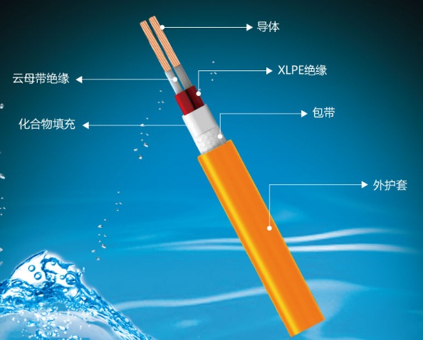 包含采用三根芯線絞合而成的絞合體和繞包在所述絞合體上的阻燃無鹵玻纖帶層以及擠包在所述阻燃無鹵玻纖帶層外的低煙無鹵阻燃護(hù)套,在所述絞合體與阻燃無鹵玻纖帶層之間填充有無機(jī)礦物材料;所述芯線包括銅芯導(dǎo)體和繞包在銅芯導(dǎo)體上的雙層云母帶層以及擠包在雙層云母帶層上的交聯(lián)聚乙烯J緣層。