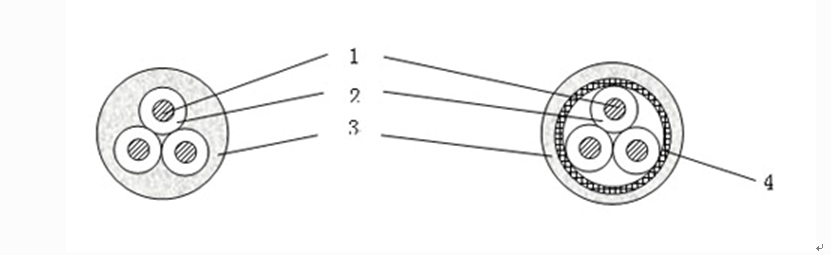 銅芯導(dǎo)體; 2--- 交聯(lián)聚烯烴J緣; 3--- 聚烯烴護套; 4--- 銅絲編織屏蔽層。