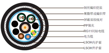 1xRG11 + 3x3電力電纜 + 2x1x2x24AWG數(shù)據(jù)線對(duì),鋼絲編織鎧裝低煙無(wú)鹵護(hù)套組合電纜